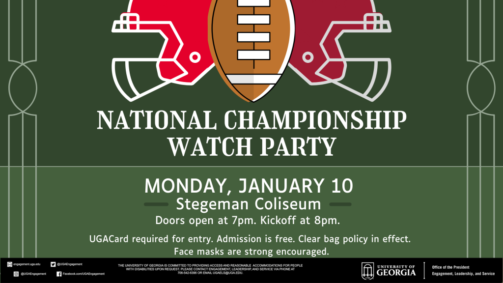 The National Championship Watch Party will be in Stegeman Coliseum located at 100 Smith St., Athens, GA 30602.